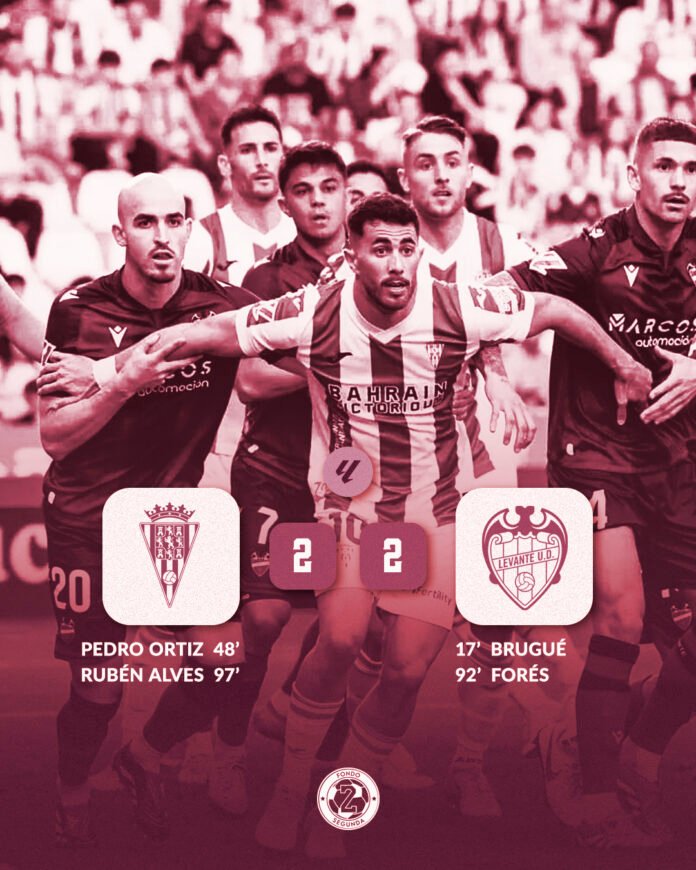 Tras un tiro de Jon Magunazelaia, bloqueado por Andrés Fernández, le quedaba el balón a placer a Theo Zidane, que se dejaba caer sobre el área tras una entrada de un zaguero del Levante. El colegiado Palencia Caballero acabaría anulándolo tras una larga revisión del VAR. En el minuto 92, los de Julián Calero parecían asaltar el feudo cordobesist,a tras una gran jugada de Álex Forés. Casi finiquitado ya el encuentro, Rubén Alves enganchaba una volea extraordinaria poniendo las tablas en el marcador.