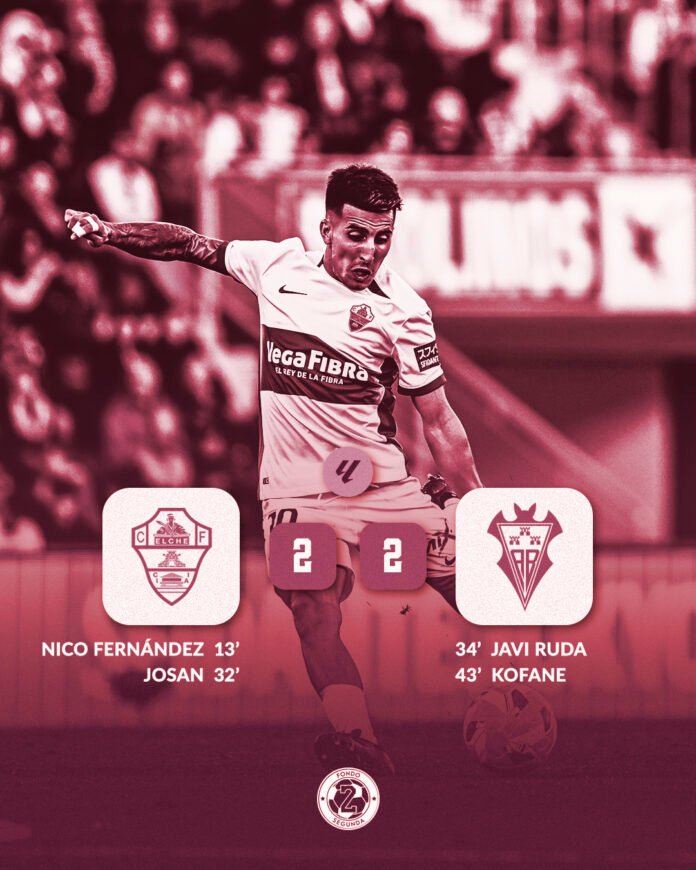 La racha de victorias del Elche como local llegó a su fin tras el empate frente un muy buen Albacete. Aún así, los ilicitanos mantienen una jornada más el liderato. Y eso que la primera media hora fue de ensueño para los intereses ilicitanos, con los goles de Nico Fernández y de Josan. Pero con todo en contra, los visitantes revivieron de forma sorprendente. Apenas dos minutos después del 2-0, Javi Rueda recortó distancias y ya cerca del descanso apareció Kofane para marcar uno de los goles de la temporada con una gran volea.