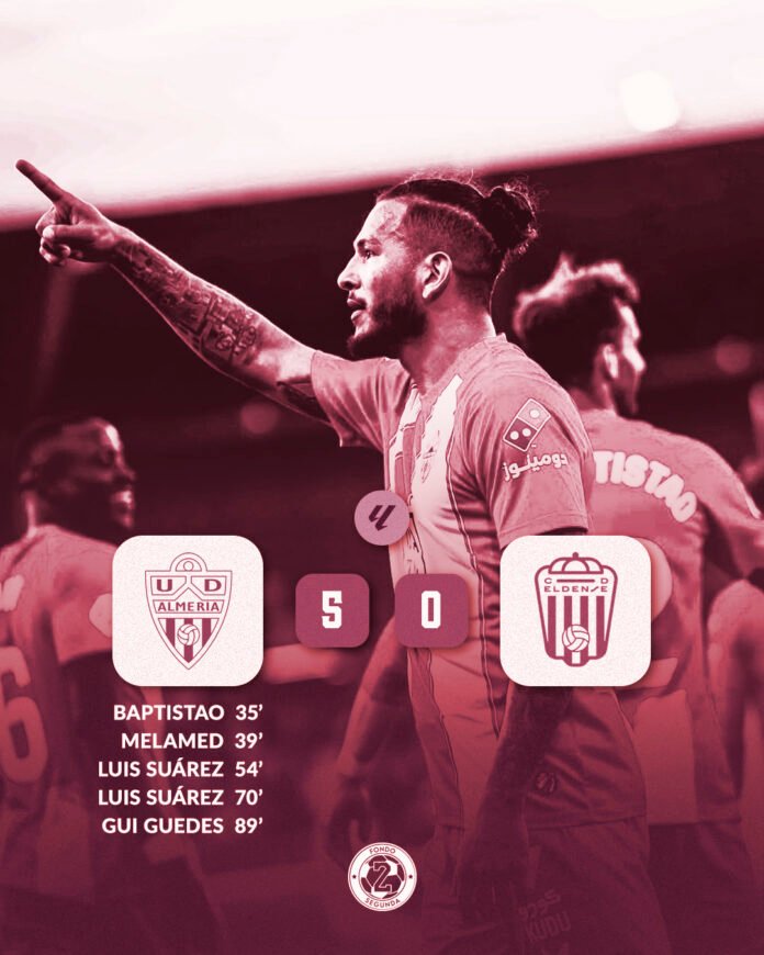 Tuvo ocasiones en la segunda mitad el Almería para haber logrado una goleada amplia. Los cambios, especialmente de Arnau y Pozo, ayudaron. Tuvo varias Melamed, alguna Luis Suárez… Y la más espectacular también fue del colombiano, que la estrelló en el palo. Completó la manita Gui Guedes, tras una espectacular asistencia del pichichi. Un gol de bandera. Fiesta en el UD Almería Stadium, que ve a su equipo de nuevo en playoff y vuelve a creer.