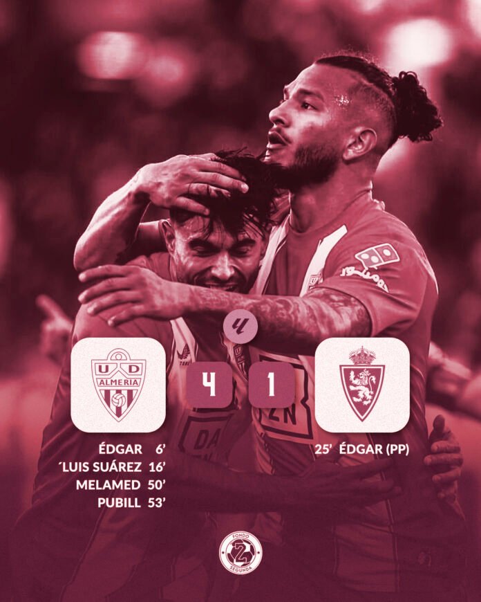 Partido de urgencias en el UD Almería Stadium. El Almería, porque queriendo luchar el ascenso directo, necesitaba ya los tres puntos. El Zaragoza, al borde del abismo. Un arranque fulgurante de los locales llevó tranquilidad a la grada. La tuvo Luis Suárez, en el córner posterior, remate al palo. Y en el rechace, disparo de Luis Javier que rebota en Édgar. El rebote coge portería y se adelanta el Almería. Siguió dominando, buscando la espalda a los centrales y tuvo otra en botas de Arnau. La réplica, una buena jugada zaragocista con disparo alto de Tasende.