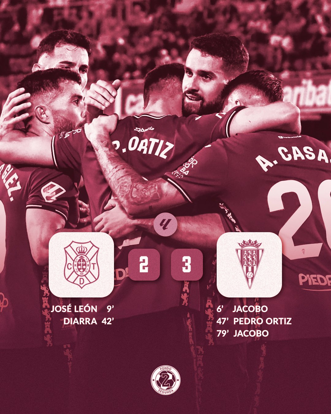 Ya al borde del final y en una acción de saque de banda, un mal despeje de Mellot lo acabó aprovechando Jacobo González para rubricar su gran actuación individual. Y asegurar el cuarto triunfo consecutivo del Córdoba como visitante.