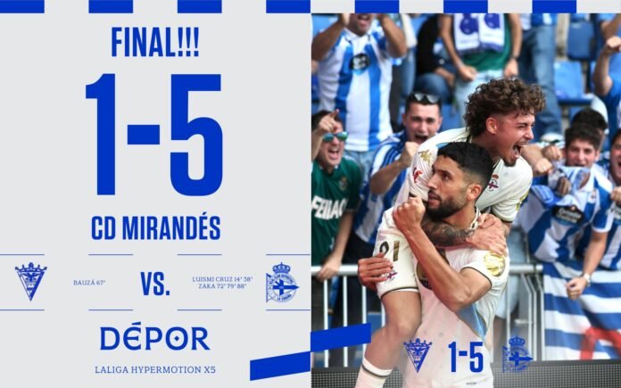 A los 2 minutos Mulattieri recupera un balón, pone la directa y en el 1vs1 la envió al poste. Un pase filtrado de Yeremay dejaba solo a italiano de nuevo que hierra en el primer toque y agarra Nikic. Subía líneas, aparecían los espacios y crecía el Dépor. Poco a poco por empuje el Mirandés también tenía las suyas pero sin mucho peligro. Hasta que llegó Bauzá con un disparo lejano que entro raso pegado al palo poniendo el 1-2 y abriendo el partido. No llevaba ni 1 min cuando una contra dejaba a Zakaria solo que la enviaba fuera. Pero de nuevo se encontró el balón 30 segundos después, lo cruzó y marcó el 1-3. Golpe durísimo para el Mirandés cuando parecía que más apretaba. Pero la cosa no quedaba ahí una contra rapidísima acababa con la asistencia de Soriano para Zakaria. 1-4 y la pegada de este Dépor es tremenda. Como no hay 2 sin 3, Zakaria anota su 3er tanto en el 87. Nueva combinación por dentro, con asistencia de Escudero para que caiga el 1-5.
