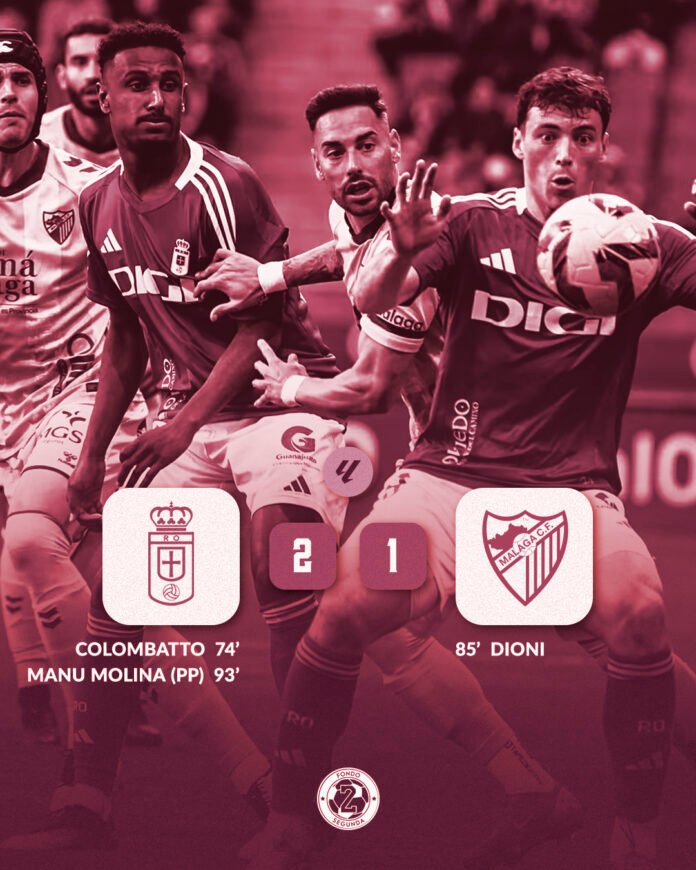 La segunda mitad inició como la primera. Sin claro dominador. Y sin ocasiones de peligro. Poco a poco se fue rompiendo el partido. Y fue el Oviedo el que tomó la iniciativa. Y tras varias ocasiones del conjunto local, llego el gol que habría la lata. Fue tras un rechace en una acción a balón parado. Colombatto envió el balón al fondo de las mayas para poner el 1-0. No tardaría en llegar la reacción malaguista, que mejoró con los cambios. Tras una gran acción trenzada, terminaría Dioni quitándole las telarañas a la escuadra. Era el 1-1 en el marcador, con un ritmo frenético en el partido. Y cuando parecía que el partido estaba acabado, en una acción aislada, Manu Molina se equivocó enviando el balón al fondo de las mallas de su propia portería. Era el 2-1 definitivo en el marcador.