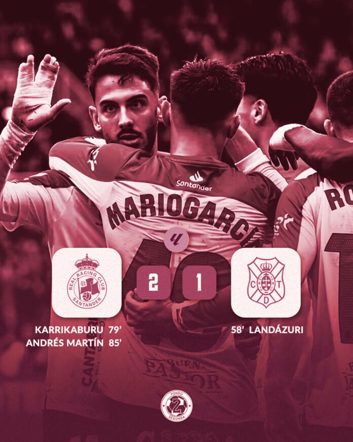 La segunda mitad fue aún más evidente para el Tenerife. El equipo chicharrero dominaba en todas las parcelas, destrozando constantemente el juego de creación de su rival. Y, a partir de ahí, construyendo transiciones peligrosas. El Racing sólo podía tratar de contener al rival, ya que no encontraban la precisión. En ese primer tramo de segunda mitad, el Tenerife terminó encontrando premio. Córner botado por Waldo Rubio y remate inapelable de Landázuri.