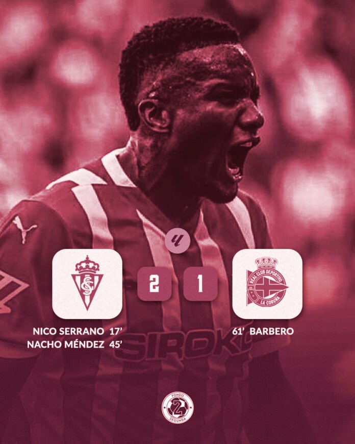 El Deportivo tenía la pelota, pero no daba sensación de peligro. El Sporting esperaba en su campo y lanzaba contraataques peligrosos. De esta forma llegó el primero del encuentro, conducción de un Gaspar Campos que abre el balón para Nico Serrano en el pico del área, el extremo navarro, lejos de ponerse nerviso, define raso al palo largo haciendo estallar al Molinón.